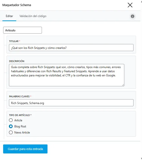 Con Rank Math, implementar Rich Snippets es fácil, pero el éxito depende de usar el schema correcto y alineado con el contenido.